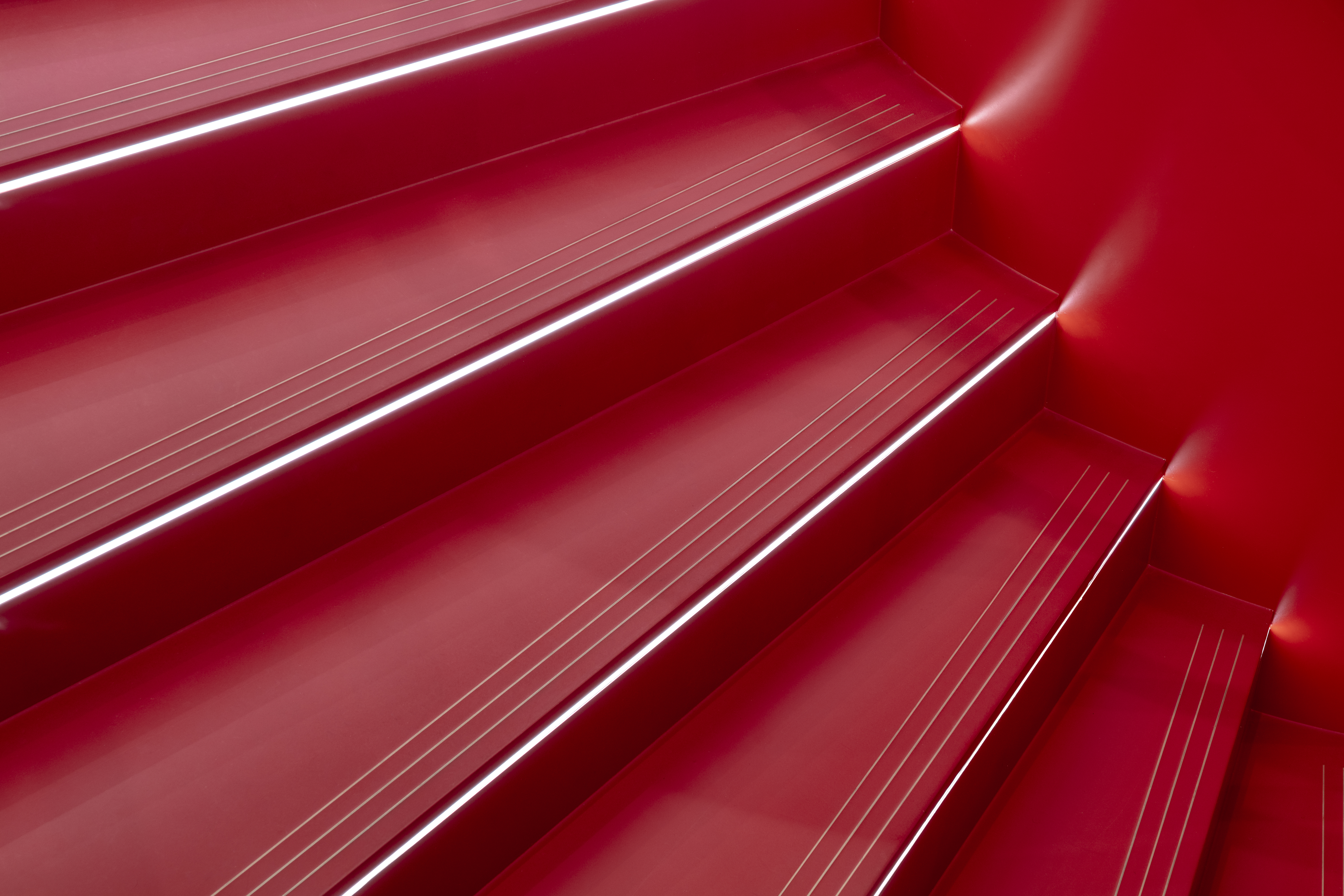 Our seamless anti-slip floor in a daring custom red colour effortlessly flows down a spiral staircase in the middle of this commercial space: a fusion of elegance and boldness.