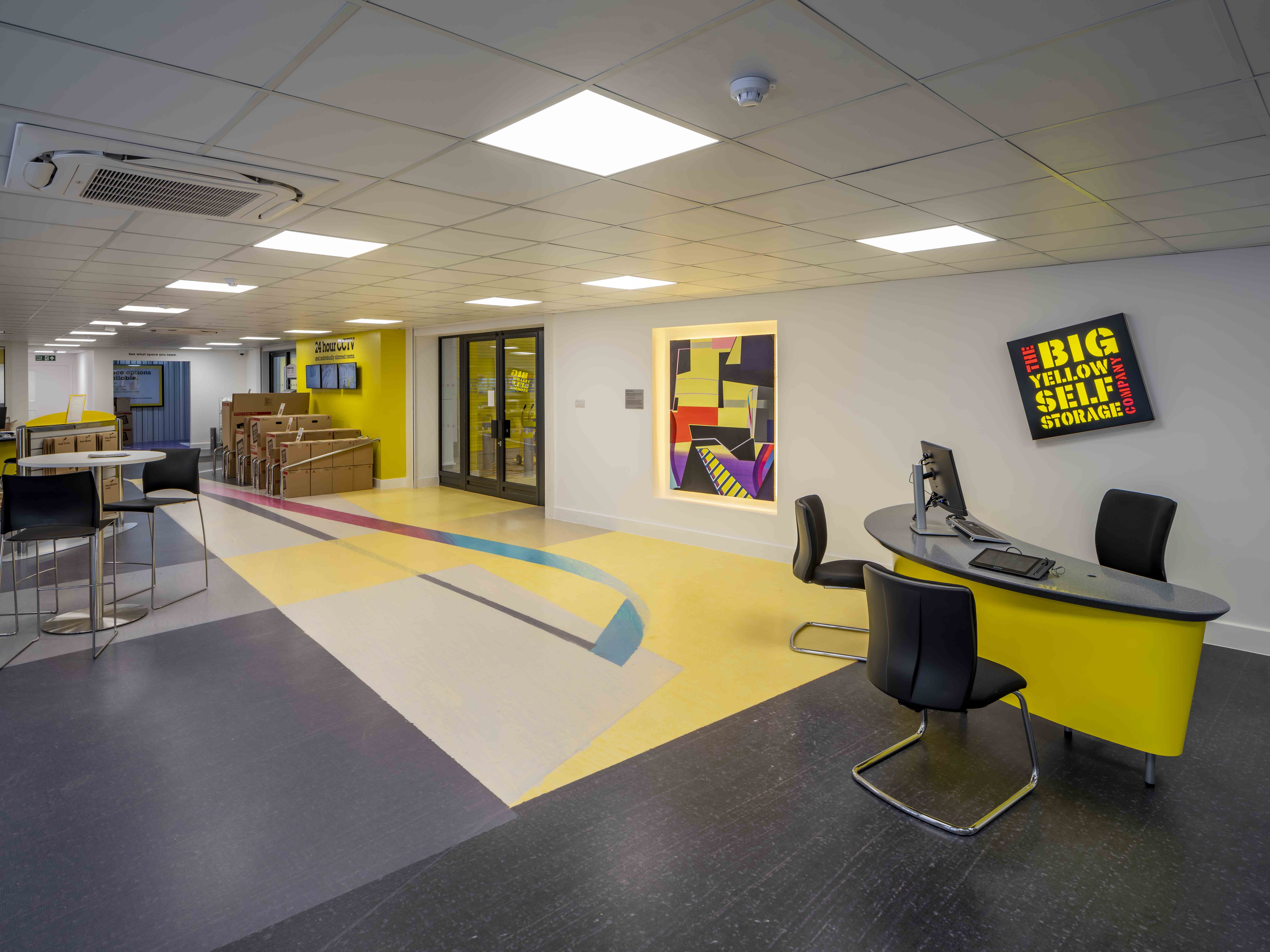 Our DesignSphere system uses a mesh layer that embeds an image into the floor and is covered with a resin layer to provide a durable surface. This means that there will not be as much damage as a floor graphic adhered to the surface to the floor. The variety of bright colours in the abstract art piece work well to make the space stand out. Using a piece of art that utilises a lot of yellow and other colours that match the corporate identity of The Big Yellow Storage Co. was a great way to make the art blend seamlessly into the space.